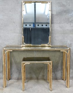 #86Een faux bamboo console met spiegel en bijzettafeltje van goudkleurig metaal, Hollywood regency stijl.