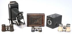 Three old opera glasses (wear), as well as three old cameras, Coronet Bobox, one with bellows, one Kodak in leather case (wear and damage). -