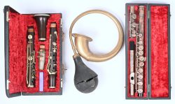 #261Een klarinet in haar koffertje, een dwarsfluit in haar koffertje en een klaxon van messing met een kapotte rubberen peer.