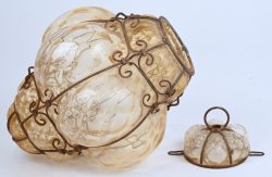 #251Een hallamp van beige geblazen glas. In smeedijzeren montuur. Eerste helft XXste eeuw.