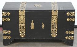 A Chinese trunk of black lacquered wood with brass mounts. One lock plate is incomplete.Dim. H 48, B 89, D 42 cmEstimate: € 100 / 150 -