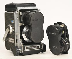 #193Een Mamiya NC1000S camera met 2 extra lenzen (35 en 135 mm), een Kenko filter en een Agfatronic 183 flits.