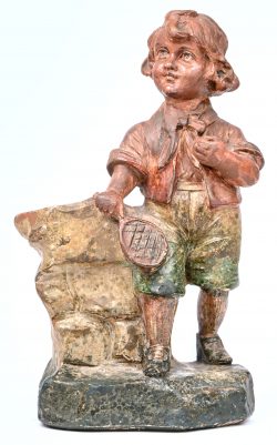 A patinated plaster figurine of a child with a tennis racket.Dim. hoogte 23 cmEstimate: € 15 / 20 -