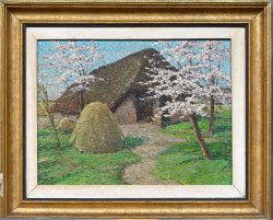 'Old Barn with Blossom Trees', oil on panel.Dim. 30/40 cmEstimate: € 50 / 70 -