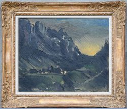 #444“Tessin 1948. Alpenzicht”. Olieverf op doek. Gesigneerd. Tentonstellingen: KMSK Antwerpen 1970 en Museum Deinze en de Leiestreek 1983.