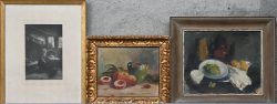 #273Een gravure met een moeder bij een wieg, Evenals twee kleine fruitstillevens op doek en op board. Niet gesigneerd.