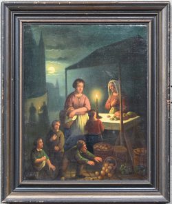 #235“Marktkraam bij kaarslicht”, een schilderij, olieverf op doek, 19e eeuws, naar voorbeeld van de Nederlandse school. Oude restauratie aan het doek.