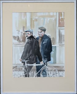 "Gentlemen by the bicycle." A painting, watercolor on paper. Signed at the bottom.Dim. 67 x 54 cmEstimate: € 60 / 90 -
