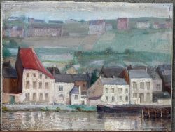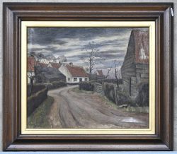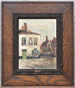 #180“Dorpszicht”, een schilderij, olieverf op doek, niet gesigneerd. Doek met kleine schade.