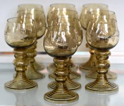 A series of ten neo-baroque Rhine wine glasses of mouth-blown olive-green glass decorated with an engraved grapevine.Dim. H. 14 cmEstimate: € 40 / 60 -