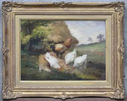 #114‘Boerenerf met kippen en een geit’, een impressionistisch olieverfschilderij op doek. Rechtsonder getekend.