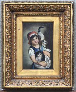 #524‘Jong meisje met haar katten’, olieverf op paneel. Niet getekend, draagt achteraan een stempel ‘Giuseppe Giasnini’.