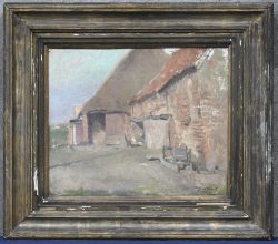 #434Period: 1900-1979“Schuur te Mortsel”, een schilderij, olie op paneel, gesigneerd J. Vinck.