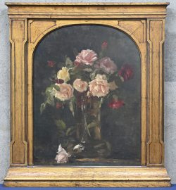 #300“Bloemenstilleven”, een schilderij, olieverf op doek in vergulde kader, gesigneerd.