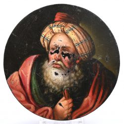 “Portrait of a man with beard and turban”, oil on panel. In the style of the 18th century, with damage. Not signed.Dim. Ø 11 cmEstimate: € 50 / 70 -