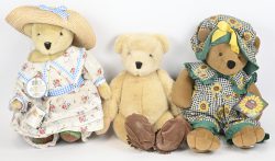 #34Drie middelgrote teddyberen, verschillende merken en afmetingen. ‘Sunflower by Russ’, ‘Alice Vanderbear’ en ‘Muffy Vanderbear’.