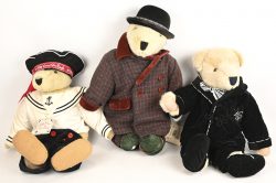 #67Drie grote teddyberen, verschillende merken en afmetingen. ‘Bibib in Chinese kledij’, ‘Tinkie Bears met jeans en sneakers’ en één merkloze beer met schaatsen en wollen outfit’.