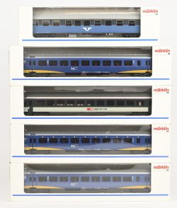 #92Vijf Märklin wagons voor personenvervoer. 42651, 42691, 42696, 43300 en 43539. In OVP.