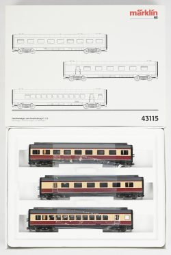 #102Een Märklin set. Tussenrijtuigen bij het dieseltreinstel VT 11.5, coupérijtuig, salonrijtuig en barwagen, 43115. In OVP.