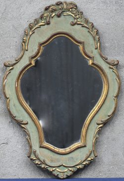 An old mirror in a green- and gold-patinated frame.Dim. 59 x 39 cmEstimate: € 20 / 30 -