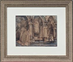 #519‘Kerkinterieur met personages’, een aquarel in gedempte tonen. Onleesbaar getekend.