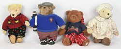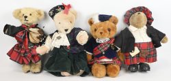 #21Vier middelgrote knuffelberen gekleed in traditionele Schotse kledij. Verschillende merken, ‘Thistle Product’, ‘Alice Vanderbear, A Highland Fling’, ‘Hamish Bear’ en één merkloos.