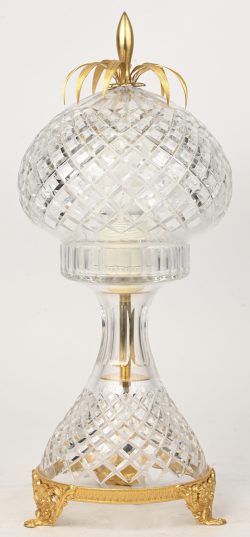 #453Een annanasvormige tafellamp, van kleurloos VSL kristal. Op een goudkleurige metalen voet. Niet gemerkt.