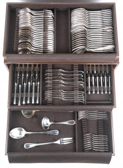 A 103-piece silver-plated metal cutlery set for 12 persons in a cutlery case. Consisting of 12 large forks, 12 small forks, 8 fish forks, 12 soup spoons, 12 small spoons, 8 coffee spoons, 11 large knives, 12 small knives, 12 fish knives, and 4 serving utensils.Estimate: € 800 / 1200 -