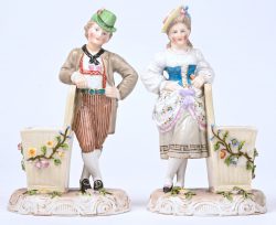 #88Een set van 2 porseleinen beeldjes/solifleurs gemerkt Rudolstadt.