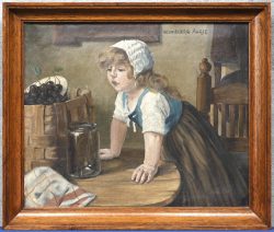 "Curious Aagje". Oil on canvas. Indecipherable signature. 19th century.No longer availableDim. h 48 x b 58 cmEstimate: € 60 / 100 -