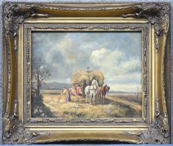 "The Hay Harvest". Oil on panel in gilded frame. Signed H. Wood.Dim. 19 x 24 cmEstimate: € 60 / 80 -