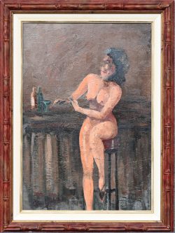 #382Period: 1921 - 1996“Naakt aan den toog”. Een schilderij, olieverf op paneel, gesigneerd Clement Van Lysebetten.