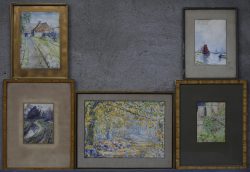 #179Period: 1879-1961“Middelburg”, “Anvers”, “Hoeve Zeeland”, “Zeilboten”, “Gevel”. Een lot van 5 schilderijtjes, aquarel op papier. Onderaan gesigneerd.