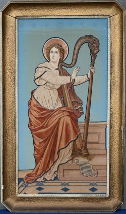 #452“Heilige Cecilia met harp”, op zijde genaaid borduurwerk, niet gesigneerd. Kleine schade bovenaan het doek.