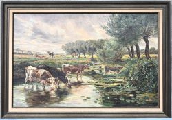 "Cows in the Ditch", a painting, oil on canvas, unsigned.Dim. 65 x 100 cmEstimate: € 60 / 80 -