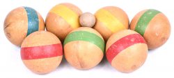 #195Een vintage set houten strandpetanqueballen, met cochonnette.