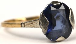#310Een 18 kt wit en geelgouden ring bezet met een syntetische saffier van +- 3 ct.