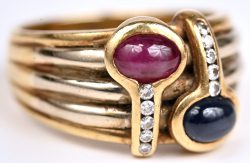 #350Een 18 kt wit en geelgouden ring bezet met diamanten met een gezamenlijk gewicht van +- 0,10 ct. en een robijn en saffier cabochone met een gezamenlijk gewicht van +- 0,80 ct.