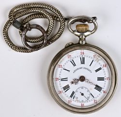 #130Een verzilverd metalen zakhorloge, Roskopf Patent, werkend. Schade aan de wijzerplaat.