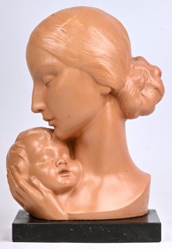 A pottery bust on a marble plinth, Art Deco, signed, numbered 2256 and marked ‘made in Belgium’.Dim. h 31 cmEstimate: € 30 / 50 -