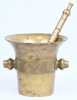 A bronze mortar with pestle.Dim. h 11.5 x Ø 13 cmEstimate: € 10 / 20 -