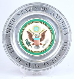 A collector’s plate depicting the Great Seal of the United States, armetale with a plastic center.Dim. Ø 28 cmEstimate: € 30 / 50 -