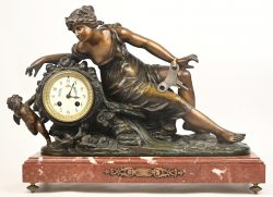 #137Een klokstel, zamak en marmer, bestaande uit een klok met beeld en 2 bijbehorende kandelaars. Draagt plaatje met opschrift: Dénicheur par Omerth.