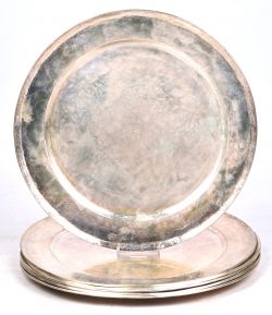 Six solid silver saucers, marked Peru 925/1000. Simply decorated border.Dim. Ø 28.5 cm - 2937 g -