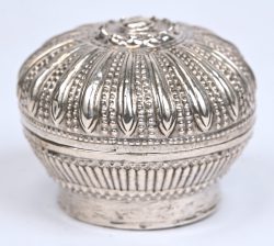 A round box of embossed silver. Indian work, unmarked. AR 4.Dim. H. 5 cm, Ø 7 cm -