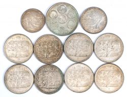 Ten Belgian silver coins. 8 x 100 francs 1950-54, 50 francs wedding anniversary of Baudouin & Fabiola and 20 francs Mercury 1950. With a total gross weight of 165 grams. Added a silver-plated coin, 150 years of Belgian independence.Dim. 165 gramEstimate: € 150 / 200 -